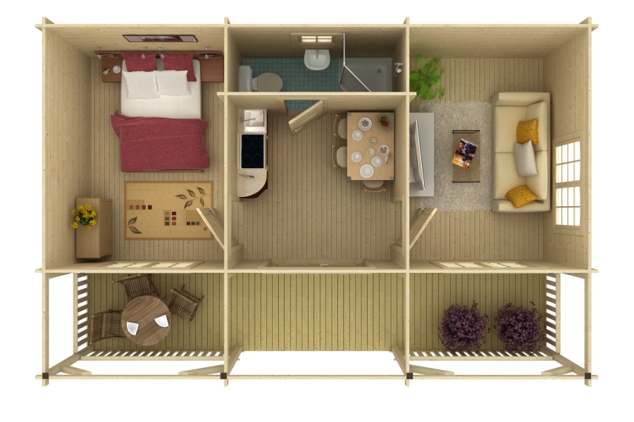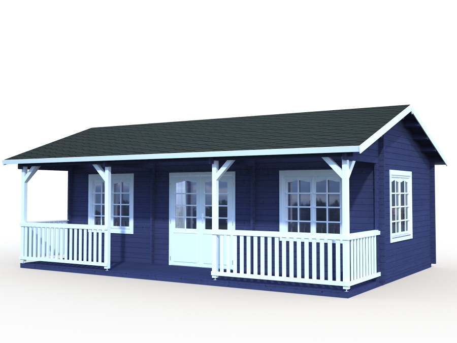There's more than 25sq m of internal floor space and 10 sq m of deck space for a summer of parties, barbecues, dabbling at being creative, or siestas, drinks and good books. The sheltered decking is the perfect backdrop for a Tennessee-style rocking chair, a breakfast table, or some serious Anne of Green Gables fantasies. The external deck may be too cold for winter breakfasts, but the rest of this log cabin summer house is warm enough for all the seasons. The timber is robust 44mm spruce, affording good levels of insulation. Windows at front, side and back are all double glazed with rubber seals and a 9mm cavity between the panes, offering exceptional energy-efficiency. The Alaska Log Cabin is a divine looking model with a fantastic, long veranda. This premium model from our Valkea range is used mainly as a large summerhouse and cabin for the entire family to entertain themselves throughout the year, whether this be during social gatherings or simply to relax in the evening with a selection of wonderful food and beverages. This building is very much like a cottage itself, we’ve known them to be used as guest accommodation in lodge parks and with expanding motel and bed/breakfast businesses. As you walk into the building you are greeted with a fabulous set of double doors and selection of windows all being double glazed, as you enter the building you can feel a sense of welcoming as if you were walking into your very own home in the garden. The Alaska is a traditional design Log Cabin with apex roof, cylinder locking double door and covered veranda featuring pressure treated terrace boards and balustrade. The walls are 44mm Chalet cut logs and 19mm tongue and groove ceiling and floor. The roof has the option of felt or shingles covering. The double-glazed windows are tilt and turn opening with rubber seals throughout. The double door has a low threshold door sill with stainless steel protective capping and laminated frame. The cabin is supplied unfinished and can be stained or painted in any colour to suit. It has a manufacturer’s 5-year guarantee.