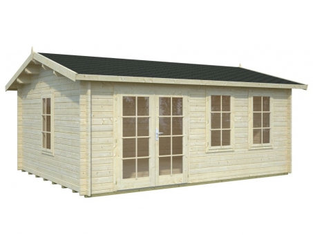 Stylishly constructed from thick 44mm Nordic Spruce, the interlocking logs and wind braces provide a strong and robust design, with authentic chalet style straight cut log ends, reflecting the high-quality build, design and materials used. The durable floor is constructed from 19mm tongue and groove cladding, well-known for its strength and weather resistance, supported by treated foundation joists providing a long-lasting and hardwearing surface for this popular outdoor space. The reverse apex roof is built from 19mm tongue and groove cladding, which makes a strong and reliable canopy for the structure. Benefitting from double glazing, the full length, double entrance doors, fitted with a cylinder lock fitted, lead into the bright and welcoming space inside. For increased strength and improved resistance to adverse reactions to extreme temperatures, such as warping or cracking, the door frames are laminated in construction. The low door sill features a stainless-steel cover to protect wood from damage in this high wear area. Light and ventilation is provided by two further double glazed opening windows. The cabin is supplied untreated with a five-year guarantee. 5-year manufacturer's guarantee • High quality 44mm Nordic Spruce interlocking logs • 19mm tongue and groove cladding floor and roof with treated foundation joists • Double glazed entrance doors with a cylinder lock and a laminated door finish providing enhanced resistance to cracking and extreme temperatures • 2 double glazed opening windows, providing light and ventilation • Rubber seals and silicone for good insulation • Low door sill, covered with stainless steel • *** Please note that NO ROOF COVERING is included, please select from the accessory options below ***