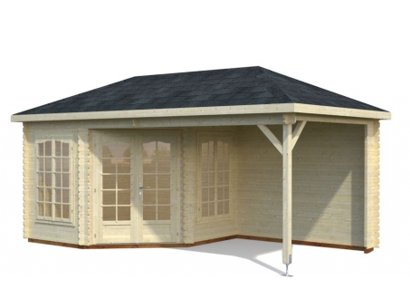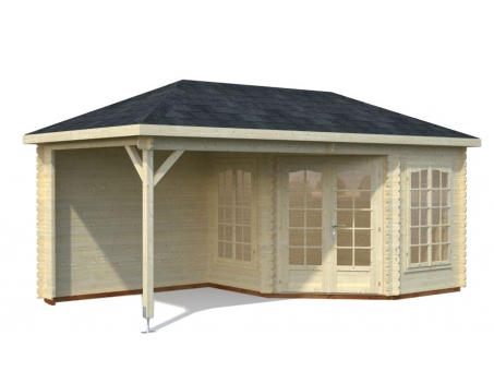 This Kentucky 1 Log Cabin is designed specifically to fit in corners of gardens, for use as a summerhouse and general garden room. The 44mm logs are of a substantial thickness meaning that the building can also be supplied with insulation alongside, meaning the use of this building can be upgraded to a home office or just a general extra room for hobbies or games. This building with shingle tiles purchased and fitted also is a beautiful model, one of the most elegant available from our entire range - recommended for those looking to beautify their garden. The Kentucky 1 is a traditionally designed Log Pavilion with cylinder locking corner entry double door, windows and canopy porch which can be positioned on either side according to choice. Real 4mm glazing is used throughout. The walls are 28mm tongue and groove construction and there is a 19mm tongue and groove internal floor and a 16mm tongue and groove roof with option of a shingles covering. The double door has a low threshold door sill with stainless steel protective capping and laminated frame. The cabin is supplied unfinished and can be stained or painted in any colour to suit. It has a manufacturer’s 5-year guarantee.