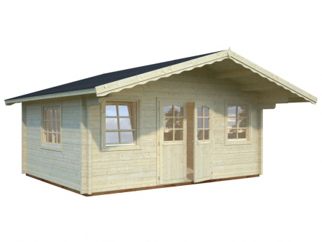 Beautifully constructed from super thick 70mm Nordic Spruce. the interlocking logs provide a robust, durable and well-insulated design. The smooth planed logs and refined finish ensure an attractive and authentic chalet style with straight cut log ends. The delightful apex roof features an overhang, which shelters you from showers and sun. Constructed from 19mm tongue and groove cladding, the roof timber is well-known for its weather resistance, durability and strength. The 19mm floor is tongue and groove cladding, providing a hardwearing and long-lasting surface, supported by treated foundation joists. Superb double-glazed entrance doors, fitted with cylinder locks fitted, lead into the generously proportioned, light and airy space. For increased strength and improved resistance to adverse reactions to extreme temperatures, such as warping or cracking, the door frames are laminated in construction. To ensure good insulation, the windows and doors are fitted with rubber seals and silicone. The low door sill features a stainless-steel cover to protect wood from damage in this high wear area. Door frames include 3D hinges, adjustable in x, y and z axis. Additional light and ventilation fills the space from the two-double glazed tilt and turn opening windows at the front and the double opening, double glazed window to the side elevation. The window features a discrete gutter designed to prevent water seepage and damage. The cabin is supplied untreated with a five-year guarantee. We advise that you apply an initial anti-fungal treatment to the log cabin, once built, and do so annually thereafter to support the guarantee. Alternatively, paint could be applied for a more individual style. • 5-year manufacturer's guarantee • High quality, super thick 70mm Nordic Spruce interlocking logs • 19mm tongue and groove cladding floor and roof with treated foundation joists • Double glazed entrance doors with a cylinder lock and a laminated door finish providing enhanced resistance to cracking and extreme temperatures • 3 double glazed, tilt and turn opening windows providing light and ventilation • Rubber seals and silicone for good insulation • A water gutter to the windows prevents water seepage and damage • Low door sill, covered with stainless steel • *** Please note that NO ROOF COVERING is included, please select from the accessory options below ***