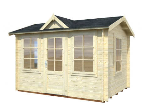 The Portland is a traditional design Log Cabin with cylinder locking single door and top hung opening widows to front and sides, all featuring real 4mm glass. The walls are 28mm tongue and groove construction and 19mm tongue and groove floor and roof with the option of felt or shingles covering. The door has a low threshold door sill with stainless steel protective capping and laminated frame. The height of this cabin is under 2.5m. The cabin is supplied unfinished and can be stained or painted in any colour to suit. It has a manufacturer’s 5-year guarantee. The Brookhaven is a traditional design Log Cabin with cylinder locking double door and surrounding windows, all featuring real 4mm glass. The walls are 34mm tongue and groove construction and 19mm tongue and groove floor and roof with the option of felt or shingles covering. The double doorway has a low threshold door sill with stainless steel protective capping and laminated frame. The cabin is supplied unfinished and can be stained or painted in any colour to suit. It has a manufacturer’s 5-year guarantee.