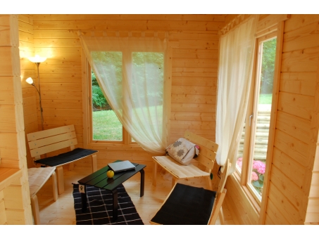 There's a lot you can do with a two-room timber garden house. Especially if its 70mm log walls make it insulated and sturdy enough for year-round use, and it's built from sturdy Nordic timber that's designed to last. Texas 1 makes a spacious weekend house for a couple or small family, or an extra space for overnight guests. Its deep windows admit enough light for use as a studio or a substantial garden office - somewhere to set up a home business or take a hobby to a new level. Possible configurations of the two rooms could be: • living room plus bedroom (a sofa bed in the living room could turn it into a weekend house for four) • workspace plus storage room for materials or finished products • open office with a private meeting room There's also space for a small kitchen/dining area in the main room. In addition to the attractive design and flexible configuration, this spacious timber office or luxury weekend house offers an array of other great features. The terrace boards are treated for extra durability. The double-glazed windows with toughened glass, silicon and rubber seals are insulated and secure. The floor is made from 28mm real wood. The Texas 1 is a traditionally designed Log Cabin with cylinder locking double door, covered porch area and toughened double glazed windows. The walls are 70mm Chalet cut logs, 19mm tongue and groove ceiling and 28mm tongue and groove floor. The roof has the option of a felt or shingles covering. The double door has a low threshold door sill with stainless steel protective capping and laminated frame. The cabin is supplied unfinished and can be stained or painted in any colour to suit. It has a manufacturer’s 5-year guarantee.